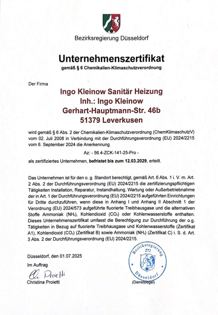 Unser Unternehmen wurde von der Bezirksregierung Düsseldorf gemäß § 6 der Chemikalien-Klimaschutzverordnung als zertifizierter Fachbetrieb anerkannt. Die Zertifizierung bestätigt unsere Qualifikation für die Installation, Wartung und Reparatur von Anlagen mit fluorierten Treibhausgasen sowie alternativen Kältemitteln wie Ammoniak (NH₃) und Kohlendioxid (CO₂). Diese Auszeichnung unterstreicht unser Engagement für fachgerechtes Arbeiten und aktiven Klimaschutz.